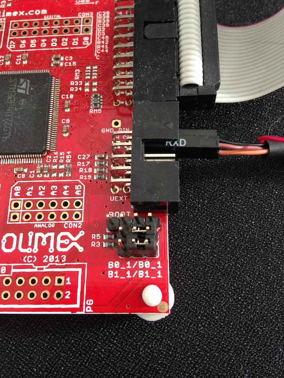 Locate the PC6/USART6_TX (pin 3), PC7/USART6_RX (pin 4), and GND (pin 2) of the UEXT connector on the Olimex board. More information on the UEXT connector can be found at https://www.olimex.com/Products/Modules/UEXT/. The schematic of the board can be found at https://www.olimex.com/Products/ARM/ST/STM32-E407/resources/STM32-E407_sch.pdf for reference.